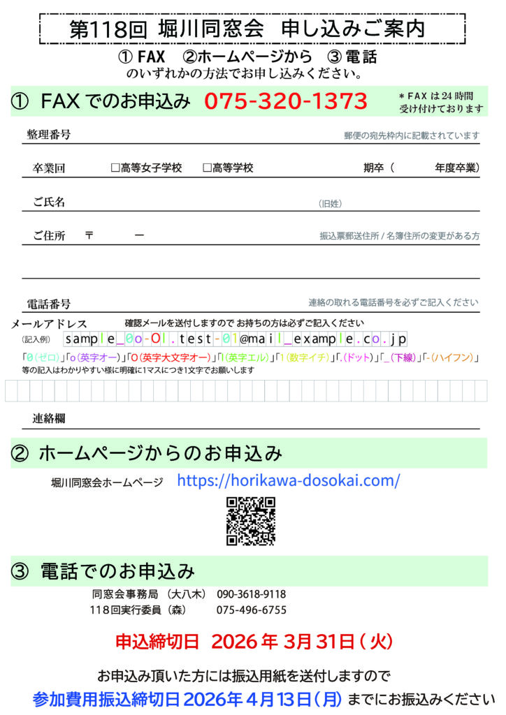 第118回堀川同窓会のご案内 118回同窓会は下記のいづれかの方法でお申込みください。 1.下記の118同窓会FAX申込書をダウンロードしてご記入の上、FAX送信 2.ホームページの「お問い合せ」のページからお申込み入力 3.118実行委員 森繁樹(090-8216-8885)または、事務局(090-3618-9118)まで